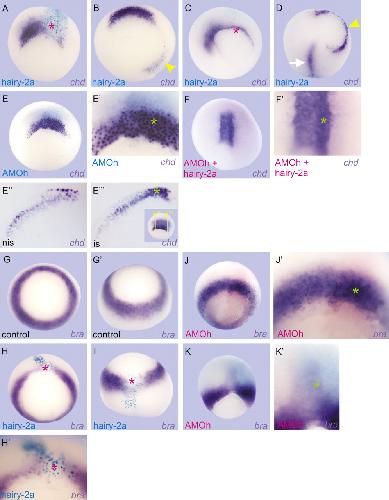 Fig. 4. hairy2a down-regulates the notochordal markers chd and bra and impairs involution of notochordal cells. (A-D) chd expression (purple) in embryos injected with 1 ng of hairy2a mRNA (turquoise X-gal staining). (A) Dorsally injected gastrula. (B) Ventrally injected gastrula. The yellow arrowhead points to the ectopic chd+ cells. (C) Dorsally injected embryo, fixed when sibling controls reached the neurula stage. (D) Ventrally injected neurula. The white arrow points to the normal axis expressing chd. The yellow arrowhead points to the ectopic chd+ cells, which were unable to involute. (E) chd expression (purple) in a gastrula injected with 10 ng of AMOh (turquoise X-gal staining). (Eâ²) Higher magnification of E. (Eâ²,Eâ´) chd expression (purple) in parasagittal sections of another gastrula injected with 10 ng of AMOh (whole embryo shown in the inset in Eâ´; yellow lines eâ²,eâ´ indicate the levels of the sections shown in Eâ²,Eâ´, respectively). (Eâ²) Non-injected side. (Eâ´) Injected side. The turquoise dots reveal the lacZ tracer. (F) chd expression (purple) in a late gastrula injected with 0.5 ng of hairy2a mRNA plus 10 ng of AMOh. The magenta staining reveals the distribution of the injected AMOh. (Fâ²) Higher magnification of F. (G) bra expression in a control gastrula, vegetal view. (Gâ²) Ventrally tilted view of the same embryo shown in G. (H,I) bra expression (purple) in gastrula stages embryos (H) dorsally or (I) ventrally injected with 0.25 ng of hairy2a mRNA (turquoise X-gal staining). (Hâ²) Higher magnification of H. (J,K) bra expression (purple) in embryos injected with 10 ng of AMOh fixed at (J) early gastrula, magenta AMO staining, or (K) late gastrula, turquoise AMO staining. (Jâ²,Kâ²) Higher magnifications of J and K, respectively. Green asterisks indicate increase effects and red asterisks, decrease effects. In all embryos the injected side is oriented to the right. |