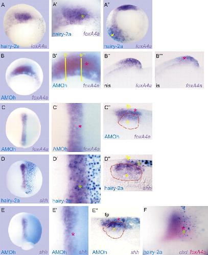 Fig. 5. hairy2a up-regulates foxa4a and shh in the FP precursors. (A) foxa4a expression (purple) in a gastrula dorsally injected with 0.25 ng of hairy2a mRNA (turquoise X-gal staining). (Aâ²) Higher magnification of A, revealing the increase of foxa4a+ cells in the notoplate precursors (green asterisk). (Aâ²) foxa4a expression (purple) in a gastrula ventrally injected with 1 ng of hairy2a mRNA (turquoise X-gal staining). The arrowhead points to the ectopic foxa4a+ cells in the ventral mesoderm region. (B,C) foxa4a expression (purple) in (B) gastrula or (C) neural plate stage embryos injected with 10 ng of AMOh, turquoise staining reveals the distribution of AMOh. (Bâ²,Câ²) Higher magnification of B and C, respectively. In Bâ² the yellow lines indicate the plane of the parasagittal sections shown in Bâ² and Bâ´, respectively. (Câ²) Transverse section of the embryo shown in C. (D) shh expression (purple) in a neurula injected with 0.25 ng of hairy2a mRNA (turquoise X-gal staining). (Dâ²) Higher magnification of D, revealing the increase of shh+ superficial cells corresponding to the prospective FP. (Dâ²) Transverse section of the same embryo shown in D. Notice the increase of shh+ cells in the FP domain on the injected side (green asterisk). (E) shh expression (purple) in a neurula injected with 10 ng of AMOh, turquoise staining reveals the distribution of AMOh. (Eâ²) Higher magnification of E, revealing the decrease of shh+ superficial cells corresponding to the prospective FP. (Eâ²) Transverse section of the embryo shown in E. Notice the decrease of shh+ cells in the FP domain on the injected side (red asterisk). (F) Expression of chd (purple) and foxa4a (magenta) in a late gastrula embryo injected with 0.25 ng of hairy2a mRNA (turquoise X-gal staining). nis, non-injected side; is, injected side; fp, prospective floor plate; n, notochord. The dotted red line demarcates the notochord. See text for details. |