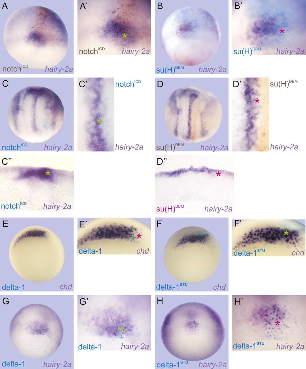 Fig. 3. Notch signalling up-regulates hairy2a in the DML precursors. delta1 represses the notochordal marker chd and activates the FP marker hairy2a. (A,C) In situ hybridization of hairy2a (purple) in embryos injected with 1 ng of notchICD mRNA fixed at (A) gastrula stage, brown c-myc staining, or (C) at neural plate stage, turquoise c-myc staining. (Aâ²,Câ²) Higher magnifications of A and C, respectively. (Câ²) Transverse section of the embryo shown in C. (B,D) In situ hybridization of hairy2a (purple) in embryos injected with 2 ng of su(H)DBM mRNA fixed at (B) gastrula (turquoise c-myc staining) or (D) at neural plate stages (c-myc brown staining). (Bâ²,Dâ²) Higher magnifications of B and D, respectively. (Dâ²) Transverse section of another neurula injected with 2 ng of su(H)DBM (magenta c-myc staining), in situ hybridization of hairy2a (purple). (E,F) In situ hybridization of chd (purple) in gastrula stage embryos injected with (E) 1 ng of delta1 mRNA (turquoise X-gal staining) or (F) with 0.5 ng of delta1STU mRNA (turquoise X-gal staining). (Eâ²,Fâ²) Higher magnifications of E and F, respectively. (G,H) In situ hybridization of hairy2a (purple) in gastrula stage embryos injected with (G) 1 ng of delta1 mRNA (turquoise X-gal staining) or (H) with 0.5 ng of delta1STU mRNA (turquoise X-gal staining). (Gâ²,Hâ²) Higher magnifications of G and H, respectively. Green asterisks indicate increase effects and red asterisks, decreased effects. In all embryos the injected side is oriented to the right. |