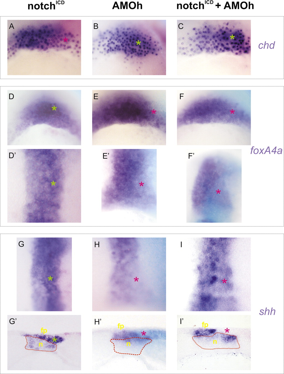 Fig. 6. hairy2a mediates the cell-fate switch executed by Notch in the DML precursors. (A-C) chd expression (purple) in gastrulae injected with (A) 1 ng of notchICD mRNA (magenta c-myc staining), (B) 10 ng of AMOh (magenta staining) or (C) 1 ng of notchICD mRNA (magenta c-myc staining) plus 10 ng of AMOh. (D-F) foxa4a expression (purple) in gastrulae injected with (D) 1 ng of notchICD mRNA (magenta c-myc staining), (E) 10 ng of AMOh (turquoise staining) or (F) 1 ng of notchICD mRNA (turquoise, c-myc staining) plus 10 ng of AMOh. (Dâ²-Fâ²) foxa4a expression (purple) in late gastrula/early neurula embryos injected with (Dâ²) 1 ng of notchICD mRNA (magenta c-myc staining), (Eâ²) 10 ng of AMOh (turquoise staining) or (Fâ²) 1 ng of notchICD mRNA (turquoise c-myc staining) plus 10 ng of AMOh. (G-I) shh expression (purple) in neurula embryos injected with (G) 1 ng of notchICD mRNA (magenta c-myc staining), (H) 10 ng of AMOh (turquoise staining) or (I) 1 ng of notchICD mRNA (magenta c-myc staining) plus 10 ng of AMOh. (Gâ²-Iâ²) Transverse sections of the embryos shown in G-I. fp, prospective floor plate; n, notochord. The dotted red line demarcates the notochord. Green asterisks indicate increase effects and red asterisks, decrease effects. In all embryos the injected side is oriented to the right. |