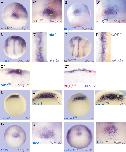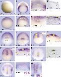 Fig. 1. Comparative expression patterns of delta1 and hairy2a. In situ hybridization of (A-Bâ²) delta1, (C-K) hairy2a, (L,M) delta1 (purple) and hairy2a (magenta) in control embryos. Stages (st) are indicated at the bottom of each figure; fp, prospective floor plate; n, notochord; hm, head mesoderm; vmn, delta1 stripe corresponding to the domain of developing primary ventral motor neurons; dotted line, dorsal blastoporal groove. The insets in G and H show low magnifications of the corresponding sagittal sections in Gâ²and Hâ². See text for details. |