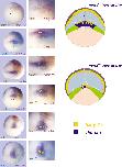 Fig. 7. Model interpreting the Notch-mediated cell-fate switch in the DML precursors. (Left) hairy2a expression (purple) in a developmental series of gastrula embryos injected with 1 ng of notchICD mRNA (brown or turquoise c-myc staining): left column, whole embryos; right column, higher magnification of the notoplate region. In all embryos the injected side is oriented to the right. (Right) Scheme illustrating the molecular and cellular changes on DML precursors after notchICD mRNA injection. See text for details. e, prospective epidermis; na, neural anlage; np, notoplate; n, notochord; ph, pharyngeal mesendoderm; white arrows, convergent-extension movements. |