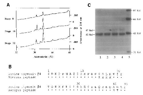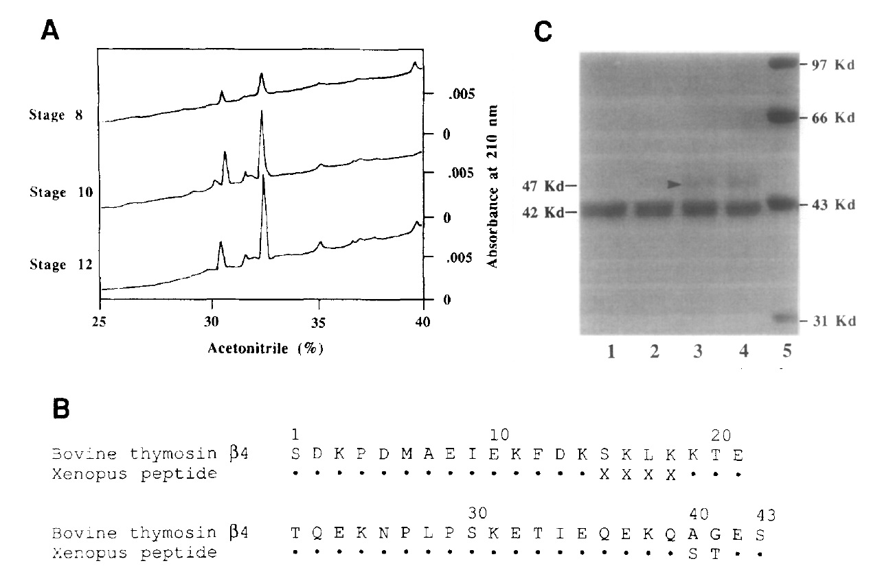 In order to investigate the molecular events which take place during gastrulation, extracts from developing Xenopus embryos were analyzed for temporal peptide distribution by high performance liquid chromatography. One peptide peak which became increasingly dominant after gastrulation was purified and partially characterized. The amino acid sequence of enzymic digests showed the peptide is extremely similar to mammalian thymosin beta 4. The peptide was capable of binding actin monomers like mammalian counterparts. Cloning of the Xenopus thymosin beta 4 cDNA showed that only three amino acid substitutions occurred between amphibian and bovine. Northern blot analysis revealed the mRNA is maternally present at a low level and the transcript becomes abundant after gastrulation, supporting the distribution of the peptide.