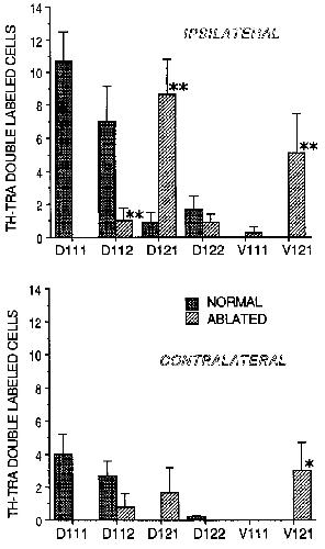 of members of the TRA-labeled clone, open circles indicate TH-positive cells, and dense-cored circles indicate double-labeled (DA-TRA) cells.