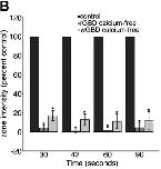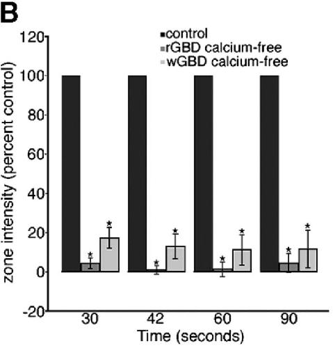 Figure 3. External calcium is required for local activation of RhoA and Cdc42. (A) Montage shows suppression of RhoA (eGFP-rGBD) and Cdc42 (mRFP-wGBD) activity zones at 90 s after wounding in calcium-free medium. Bars, 10 μm. (B) Quantification of GBD zone fluorescence intensity in the absence of external calcium, relative to controls, over time (n = 11; results are shown as means ± SEM; asterisks indicate P < 0.001). |