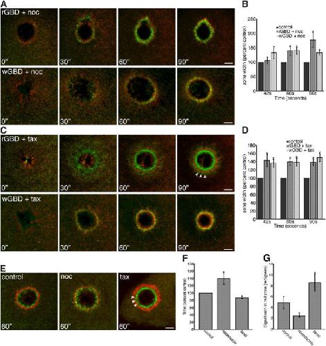 Figure 5. Microtubules and rho GTPase activation. (A) Montage shows the broadening of RhoA (rGBD) or Cdc42 (wGBD; green) activity relative to actin (red) in cells treated with nocodazole (noc; time in seconds). Bars, 10 μm. (B) Quantification of GBD zone width over time in the presence of nocodazole, relative to controls (n = 3; results are shown as means ± SEM; asterisks indicate P < 0.05). (C) Montage shows the broadening of RhoA (rGBD) or Cdc42 (wGBD; green) activity zones relative to actin (red) in cells treated with taxol (tax; arrowheads show rGBD signal on the outside of the actin array; time in seconds). Bars, 10 μm. (D) Quantification of GBD zone width over time in the presence of taxol, relative to controls (n = 3; results are shown as means ± SEM; asterisks indicate P < 0.05). (E) Montage shows the segregation of RhoA (rGBD; green) and Cdc42 (wGBD; red) activity zones at 60 s after wounding in control and nocodazole- and taxol-treated cells (arrowheads show gap between zones in taxol). Bar, 10 μm. (F) Quantification of the time needed for GBD zone segregation in the presence of nocodazole or taxol, compared with controls (n = 11; results are shown as means ± SEM; asterisks indicate P < 0.05). (G) Quantification of zone segregation, comparing signal ratio (red/green; mRFP-wGBD/eGFP-rGBD) in the red zone, of controls and oocytes treated with nocodazole or taxol (n = 9; results are shown as means ± SEM; asterisks indicate P < 0.05). |