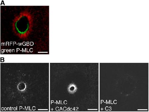 Figure 7. Activity zones and myosin-2 light chain phosphorylation. (A) Confocal image shows phosphorylated myosin-2 regulatory light chain staining (P-MLC; green) circumscribed by Cdc42 activity (red) in a fixed cell. Bar, 25 μm. (B) Confocal images of fixed cells show that P-MLC staining is broadened in cells treated with CACdc42 and reduced with C3, compared with control, at 3 min after wounding. Bars, 25 μm. |