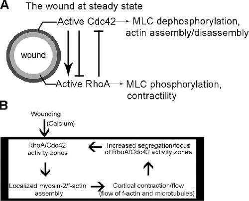 Figure 9. Summary, crosstalk, and working model for observed discrete localization of rho GTPase activity zones during wound healing. (A) Schematic shows observed concentric subcellular compartmentalization of RhoA and Cdc42 activity zones at wound border, summary of crosstalk, and their respective effects on actin dynamics. (B) Diagram shows working model for maintenance of wound-induced response. Upon wounding, a cytoplasmic activity module (inside box) is established in which activation of localized RhoA and Cdc42 leads to directed cortical contraction and flow, which cause accumulation of both actin and microtubules, which, in turn, further promotes zones of activity. |