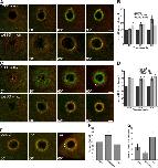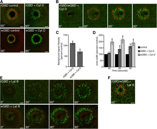 Figure 4. F-actin and rho GTPase zones. (A) Montage shows RhoA (rGBD) or Cdc42 (wGBD) activity zones (green) relative to actin (red) in controls and cytochalasin D–treated cells (Cyt D) at 90 s after wounding. Bars, 15 μm. (B) Montage shows that RhoA (rGBD; green) and Cdc42 (wGBD; red) activity zones appear and segregate in the presence of cytochalasin D during wound healing (time in seconds). Bar, 10 μm. (C) Quantification of GBD fluorescence intensity in resting oocytes in the presence of cytochalasin D, relative to controls (n = 5; results are shown as means ± SEM; asterisks indicate P < 0.05). (D) Quantification of GBD zone width over time in the presence of cytochalasin D, relative to controls (width refers to the distance from the outer edge of the zone to the inner edge; n = 7; results are shown as means ± SEM; asterisks indicate P < 0.05). (E) Montage shows activity zones of RhoA (rGBD) or Cdc42 (wGBD; green) relative to actin (red), in the presence of latrunculin B (Lat B), during wound healing (time in seconds). Bars, 10 μm. (F) Confocal image shows activity zones of RhoA (green) and Cdc42 (red) 60 s after wounding in the presence of latrunculin B. Bar, 10 μm. |