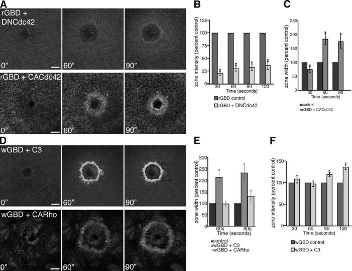 Figure 6. Crosstalk and rho GTPase zones. (A) Montage shows a decrease in RhoA activity zone intensity (rGBD) in the presence of DNCdc42 and an increase in zone width in the presence of CACdc42 (time in seconds). Bars, 10 μm. (B) Quantification of rGBD zone fluorescence intensity over time in the presence of DNCdc42 relative to controls (n = 8; results are shown as means ± SEM; asterisks indicate P < 0.05). (C) Quantification of rGBD zone width over time in the presence of CACdc42, relative to controls (n = 11; results are shown as means ± SEM; asterisks indicate P < 0.05). (D) Montage shows an increase in Cdc42 activity zone intensity (wGBD) in the presence of C3 and an increase in zone width with both C3 and CARho (time in seconds). Bars, 10 μm. (E) Quantification of wGBD zone signal width over time in the presence of C3 or CARho, relative to controls (n ≥ 4; results are shown as means ± SEM; asterisks indicate P < 0.05). (F) Quantification of wGBD zone fluorescence intensity over time in the presence of C3, relative to controls (n = 8; results are shown as means ± SEM; asterisks indicate P < 0.05). |