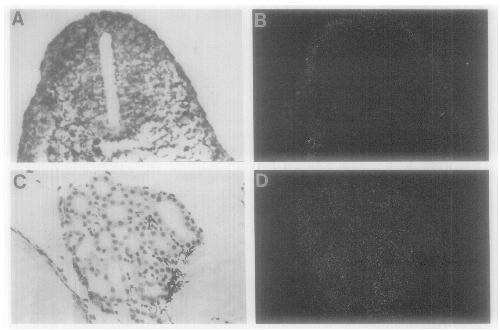 FIG. 2. In situ hybridization. (A) Section of a stage 26 embryo stained with Azur B. (B) Adjacent section of stage 26 embryo hybridized with