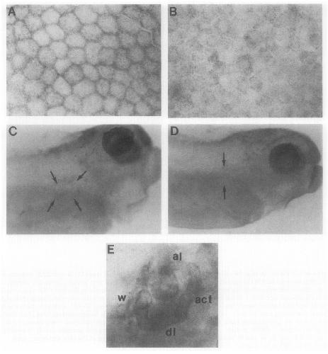 tubule. (D) Control stage 41 whole-mount embryo. Arrows indicate pronephric area with no specific staining. (E) Higher magnification of stage 41 pronephros. al, ascending limb; act, anterior convoluted tubule; dl, descending limb, w, wolffian duct. (Parts of pronephros from Tytler, 1933). Magn. of A and B is 1000~. Magn. of C and D is 25X. Magn. of E is 60X. |