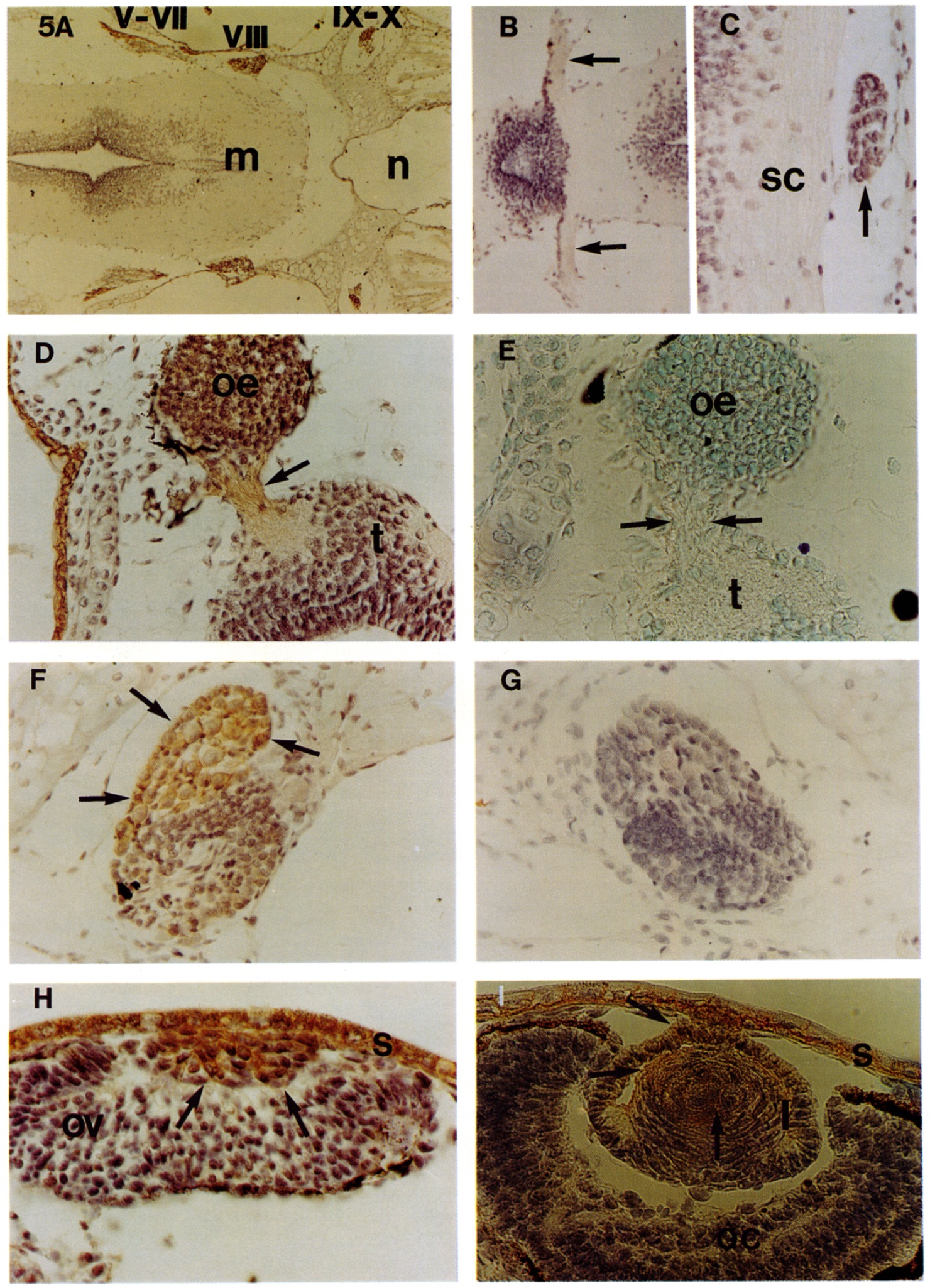 roman numerals indicate and are located above the ganglia of cranial nerves V/VII, VIII, and IX/X, m, medulla, n, notochord. (B) Section from