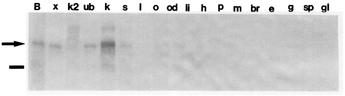 eye; g, gut; sp, spleen; gl, gall bladder. The arrow indicates the llO-kDa major band and the bar indicates the location of the 9%kDa marker.