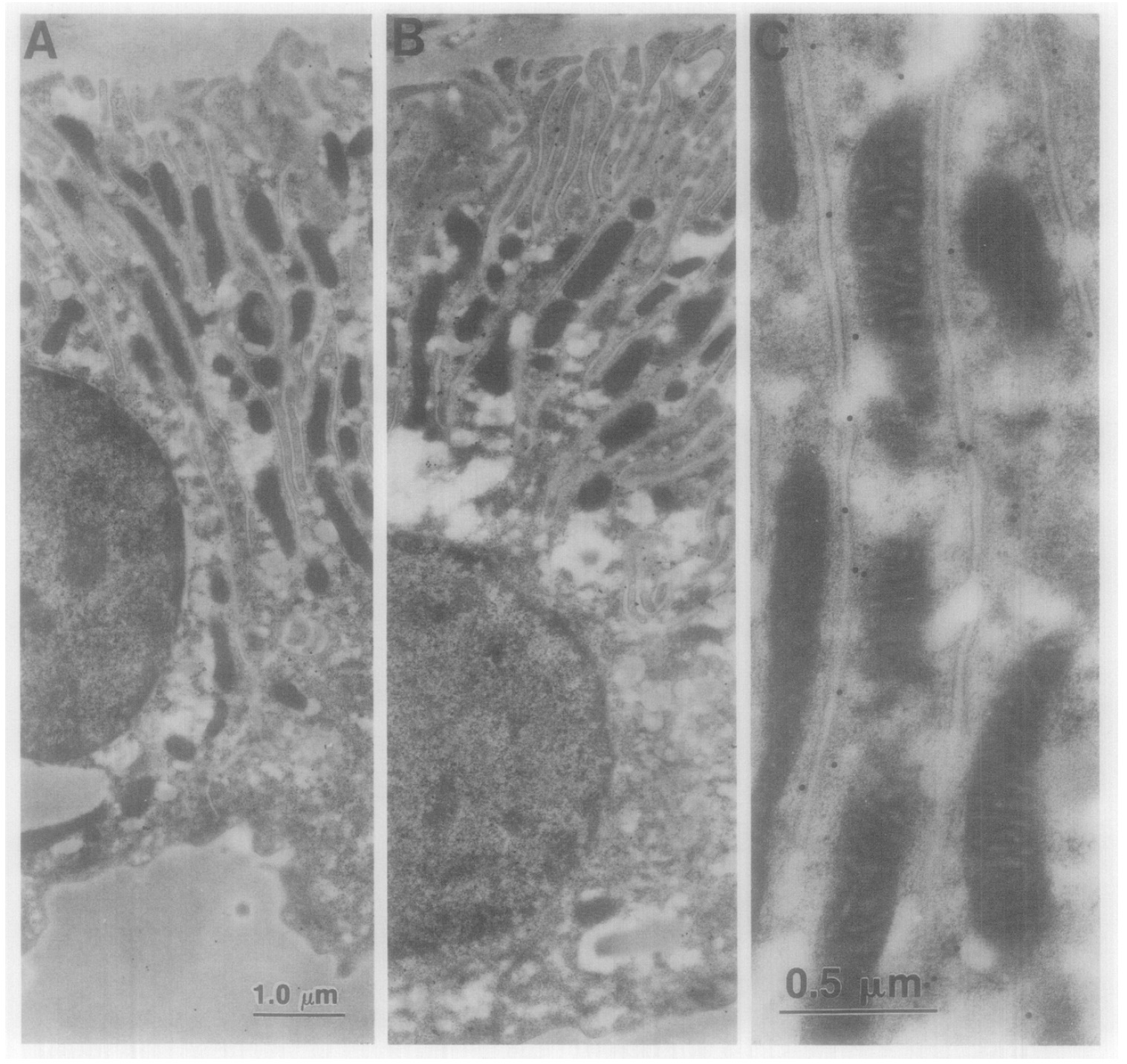 FIG. 8. Electron microscopy of distal tubule. (A) Preimmune, Protein A purified IgC control. (B) L13 pAb specific binding over the basal