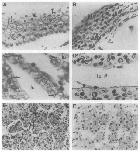 indicate the region of the lateral membranes. (F) Adjacent, control section of stomach parietal glands. Magn. of A and B is 1000X. Magn. of C