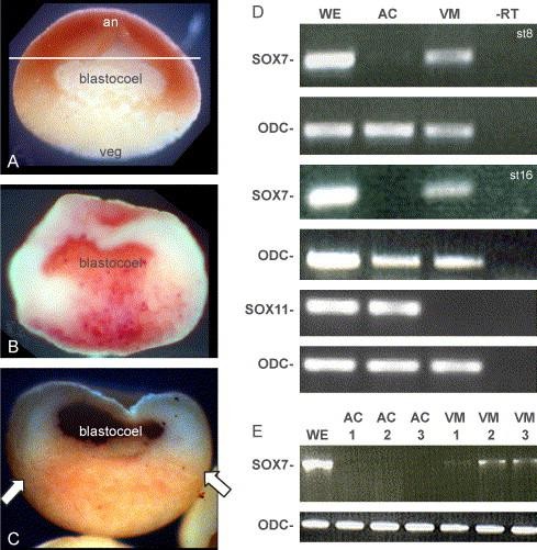 Fig. 2. Localization of SOX7 RNA. In situ hybridization of longitudinally bisected blastula stage embryos reveals the animal hemisphere concentration of SOX3 (A) RNA, while SOX17 RNA is localized to the vegetal region (B). While staining for SOX7 RNA was consistently quite weak, it was clearly restricted to the vegetal hemisphere (C). Embryos at stage 8 were dissected into animal caps (AC) and vegetal masses (VM) (indicated by white line in part A) and then analyzed for SOX7 or SOX11 mRNA by RT-PCR (D) either immediately (st8) or after they had been cultured until control embryos reached stage 16 (st16). Primers for ornithine decarboxylase (ODC) were used as a control for cDNA quality; the absence of reverse transcriptase (-RT) was used to control for the presence of contaminating DNA. At both time points, SOX7 mRNA was restricted to the vegetal mass; under similar conditions, SOX11 mRNA was restricted to the animal hemisphere. (E) A second set of SOX7-specific primers (Table 1 âSOX7 codingâ) was used to confirm the vegetal localization of SOX7 RNA. Animal caps and vegetal masses were prepared at stage 8 and analyzed either immediately (â1â), after 2 h (â2â), or when control embryos had reached stage 27 (â3â); these primers amplified a fragment of the expected size (1kb) that was again restricted to the vegetal mass.