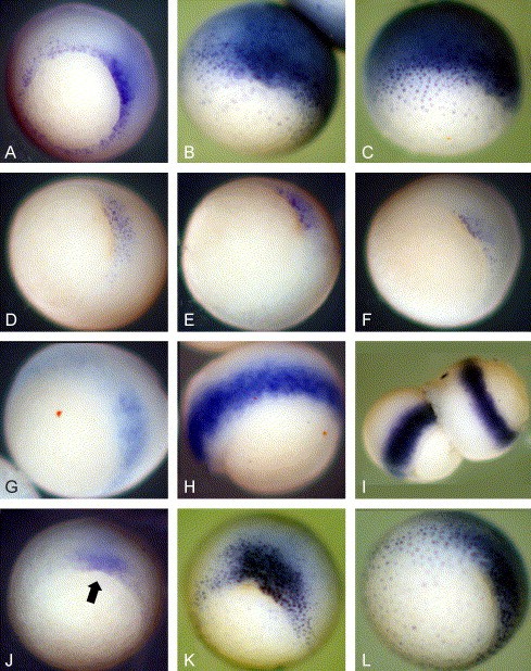 Fig. 3. SOX7 induces the endodermal marker endodermin. Fertilized eggs were injected with RNA encoding SOX7-GFP (B and C), allowed to develop to stage 11, and were then stained for Edd RNA. Compared to uninjected embryos (A), the extent and intensity of Edd staining was greatly increased in SOX7-GFP RNA-injected embryos. We compared the effects of injecting embryos with RNAs encoding VegT-EnR (D and G), Mixer-EnR (E and H), and SOX7δC-EnR-myc (F and I). All three EnR-repressor chimeras produce a similar decrease in the level and extent of Edd expression (DâF). In contrast, while VegT-EnR suppressed Xbra expression (G), both Mixer-EnR (H) and SOX7δC-EnR-myc (I) appeared to increase the level of Xbra expression; this increase was confirmed by QPCR (data not shown). When SOX7-GFP and VegT-EnR RNAs were injected together, the level and extent of Edd expression (K and L) was increased compared to the level observed in control (A) or VegT-EnR RNA injected embryos (D and J).