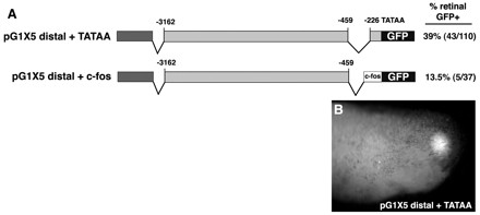 The distal cis-regulatory region of Xath5 alone is sufficient to promote transgene expression in the developing retina. (A) A PstI fragment that lacks the conserved proximal region promotes retinal transgene expression when coupled to either the pG1X5-TATAA basal promoter (pG1X5 distal + TATAA) or to the Fos basal promoter (pG1X5 distal + Fos). (B) Fluorescent image of a stage 30 pG1X5distal+TATAA transgenic embryo showing expression of the transgene in the retina.