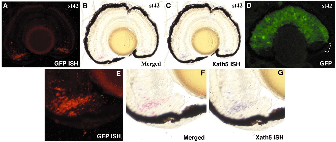 Fig. 3. The proximal regulatory region mimics endogenous Xath5 retinal expression in the ciliary marginal zone. (A-C) Double in situ hybridization on retinal sections from stage 42 embryos comparing expression of the GFP transgene mRNA (red; A,B) as driven by the pG1X5-proximal construct to endogenous Xath5 mRNA (purple; B,C). (D) Unlike the RNA, GFP protein is found throughout the central retina and in many cell types at stage 42. Bracket marks the CMZ, which lacks GFP fluorescence. (E-G) Higher magnification images of the ciliary marginal zone (CMZ) from A-C showing cell-by-cell correlation of GFP (red) and Xath5 (purple) mRNAs.