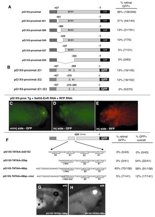 Proximal transgene expression is dependent upon conserved E-boxes and bHLH activity, but E-boxes alone are not sufficient for retinal expression. (A) Sequential deletions of the Xath5proximal region: pG1X5-proximal-401 provided robust retinal GFP expression while pG1X5-proximal-389, -349 and -337 drove weaker retinal expression and at reduced frequency. (B) Mutation of either E1 or E2 (δE) reduced the percentage of embryos expressing GFP while mutation of both eliminated all transgene expression. (C-E) Injection of RNA for the dominant-negative Xath5-EnR suppressed expression of the pG1X5-proximal GFP transgene on the injected side (D) compared with the uninjected side (C). RNA encoding RFP (red) was co-injected to mark the injected side (E). (F) Multimerized E-boxes (pG1X5-TATAA+2xE1E2) were not sufficient to promote expression, while the E-boxes and adjacent α-box (pG1X5-TATAA+33 bp) promoted non-specific GFP expression throughout the CNS and head musculature (GFP+ overall), but did not promote specific retinal expression. The pG1X5-TATAA+48 bp transgenic construct promoted GFP expression in a Xath5-like pattern, but also in the axial somites, with a small percentage only showing expression in axial somites (contributing to the increase in overall GFP+ embryos). The robustness of transgene expression was reduced by mutation of the α-box with the pG1X5-TATAA+48 bp transgenic construct. (G) pG1X5-TATAA+33 bp is expressed non-specifically in CNS and muscle (H) pG1X5-TATAA+48 bp transgene is expressed in Xath5-like pattern and in axial somites. Asterisk indicates gut autofluorescence.