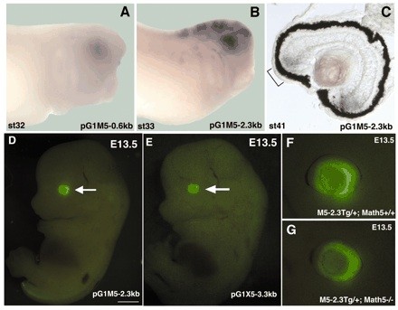 Cross-species analysis of Ath5 transgene expression. (A) The proximal 600 bp of the Math5 cis-regulatory region drives weak GFP expression in the retina of transgenic frog embryos, as shown by in situ hybridization on a pG1M5-0.6 kb transgenic Xenopus embryo. (B) GFP in situ hybridization in a pG1M5-2.3 kb transgenic embryo. The 2.3 kb Math5 fragment drives strong transgene expression in the retina, cranial ganglia, midbrain and hindbrain regions in transgenic Xenopus embryos. (C) In situ hybridization on retinal sections from stage 41 pG1M5-2.3 kb transgenic embryos shows that the domain of GFP mRNA is restricted to the CMZ (bracket). (D) E13.5 whole embryo image demonstrating retinal expression of the pG1M5-2.3 kb transgene in mouse embryos at E13.5 (arrow). (E) The Xenopus 3.3 kb Xath5 transgene (pG1X5-3.3 kb) also shows retinal expression at E13.5. (F,G) Math5 is not required for expression of the pG1M5-2.3 kb transgene as equivalent fluorescence from the transgene was observed between wild-type (F) and Math5(G) embryos. Scale bar: 500 μm in D.