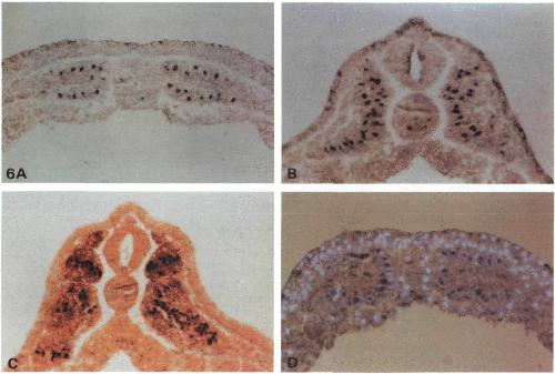 Fig. 6. XMyoD is present only in myotomal nuclei of neurulae and tailbud embryos. Transverse sections of (A) an early neurula (st12.5-13), and (B) an early tailbudembryo (st23) stained with D7F2. (C) Section through the posterior part of the segmented region of a tailbudembryo (st26) stained for XMyoD (blue-purple) and 12/101 antigen (red), showing that all XMyoD-expressing nuclei are in 12/101-positive cells. (D) Section through mid-neurula (stl5-16) stained with D7F2 for XMyoD and with Hoechst 33258 to show all nuclei. XMyoD non-expressing nuclei show the bright, light blue Hoechst fluorescence; XMyoD expressing nuclei show a darker blue due to Hoechst fluorescence shining through the dark BCIP/NBT blue purple reaction product. All clearly myotomal nuclei express XMyoD.