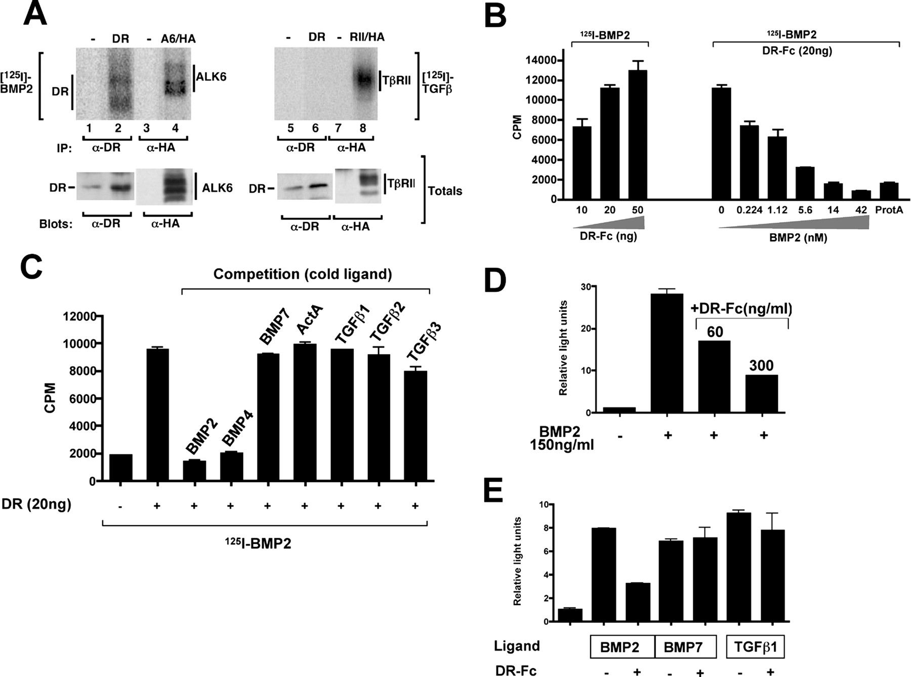 DRAGON-Fc were incubated with [125I]-BMP2 in the presence of increasing amounts of competing unlabeled BMP2 (0–42 nM) (right graph). C,
