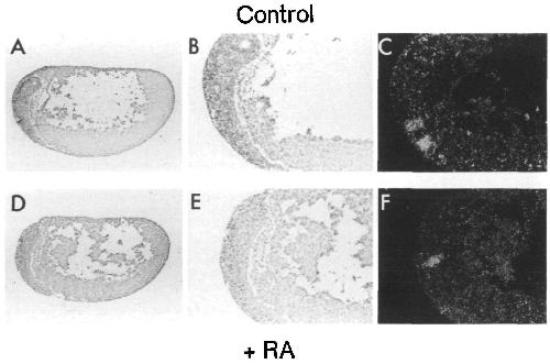 RA-treated embryos (D-F) at stage 20 using a Xenopus Krox-20 probe. (A,D) shows a low power bright-field sagittal