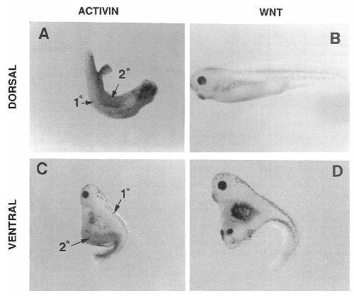 Xenopus activin BB mRNA (A and C) or 2-4 pg of mouse Wnt-1 mRNA (B and D). Injected embryos were allowed to develop for 2 days at room