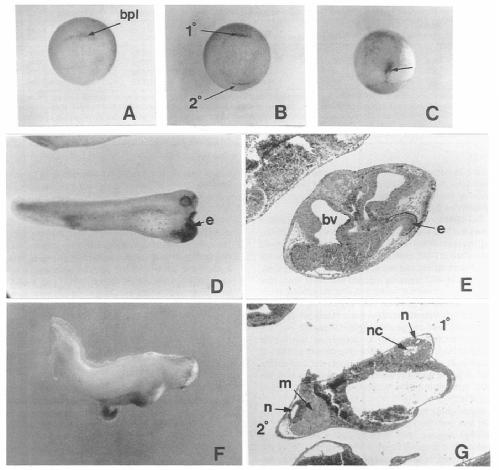 embryos injected with Xwnt-8 (D and E) or with activin be (F and G) mRNAs are shown. Histological sections (E and G) of such embryos show double