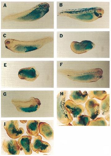 (D-G) Injections of mRNAs into UV-ventralized stage 6 embryos. (D) Marginal blastomeres with 0.5 ng of 6-galactosidase mRNA. (E) Animal