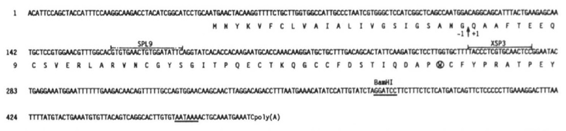 pXSP-5' -3.3 (positions 1-258) and pXSP-3' -4.1 (positions 183-483). 'fhe potential cleavage site for