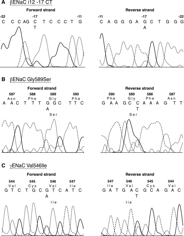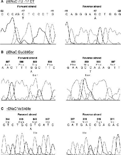 Figure 2. Sequence analysis of the variant β and γENaC alleles. Chromatograms from both sequencing directions, nucleotide substitutions and predicted amino acid changes from three different hypertensive patients are shown.