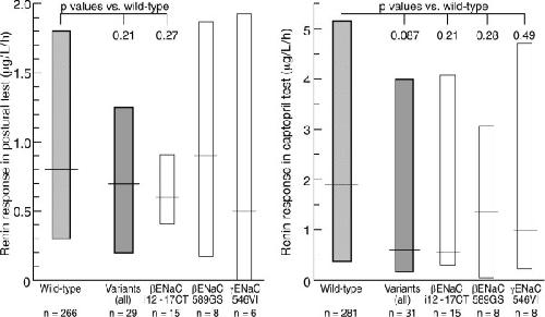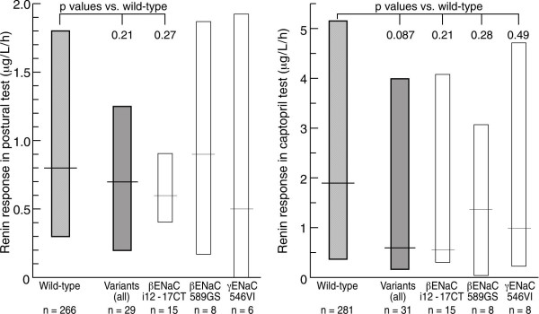 Figure 4. Renin responses in postural and captopril tests. Plasma renin responses (median and interquartile ranges) during the postural and captopril challenge tests (stimulated values minus baseline values in both cases) in carriers and non-carriers of the variant ENaC alleles.