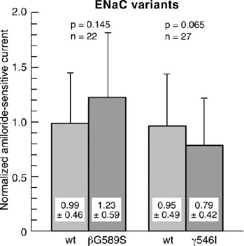 Figure 5. Channel activity of βENaC G589S and γENaC V546I variants in vitro. Comparison of channel activity of hENaC wild-type, and the βhENaC G589S and γhENaC V546I variants, when expressed in Xenopus oocytes. ENaC activity was measured as amiloride-sensitive Na+ current. Absolute currents were 5.09 ± 0.98 and 6.75 ± 1.23 μA for ENaC wt in the two series of experiments (number of oocytes given in parentheses).