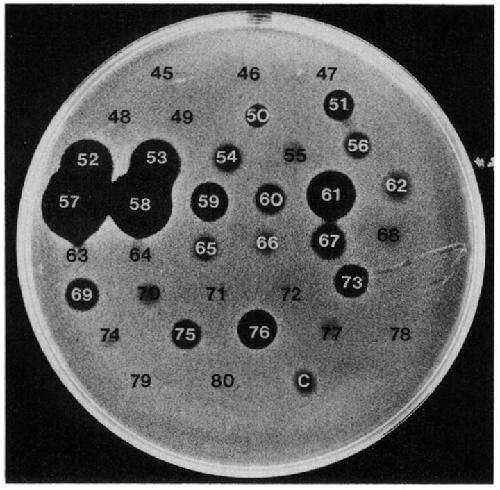poured lawn of E. coli D31. Clear areas indicate lysis of bacteria. 45-