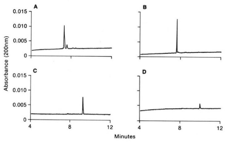 FIG. 4. Determination of purity by capillary electrophoresis of reverse&phase HPLC fractions. samplweass injected onto a 72-cm capillary with 50 mM sodium phosphate, pH 2.5, at 45 C, with a 25 kV current. A, fraction 57; B, fraction 61; C, fraction 73; D, fraction 75