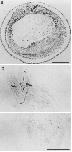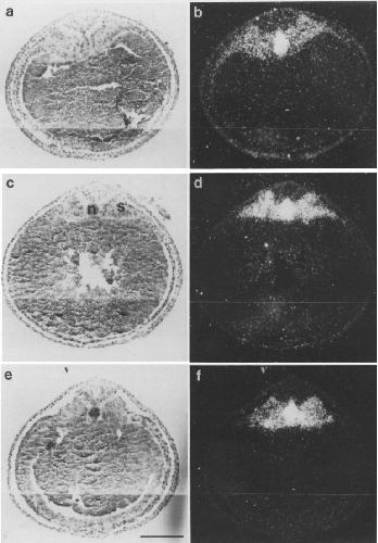 Figure 9 Bright-field (a, c, and e) and dark-field (b, d, and f) micrographs of cross sections at three different levels through a stage 21 embryo probed for type II procollagen mRNA with the general probe.