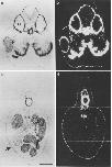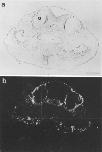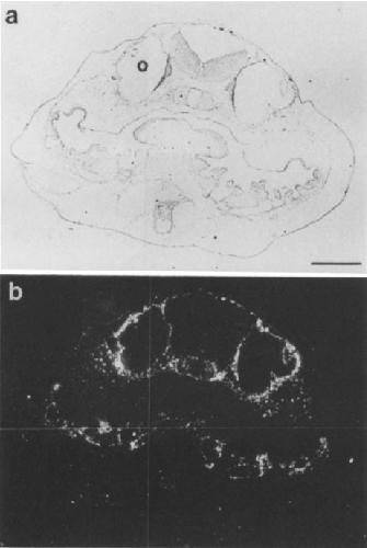 Figure 12. Immunolocalization of type II collagen at stage 46 in the head (a), as seen in frontal section, and the trunk (b), shown in cross section. Antigen is detected in the chondrocranium, eye (e), vertebra, and other regions expressing the mRNA, with the exception of the ectoderm Bar, 250 um
