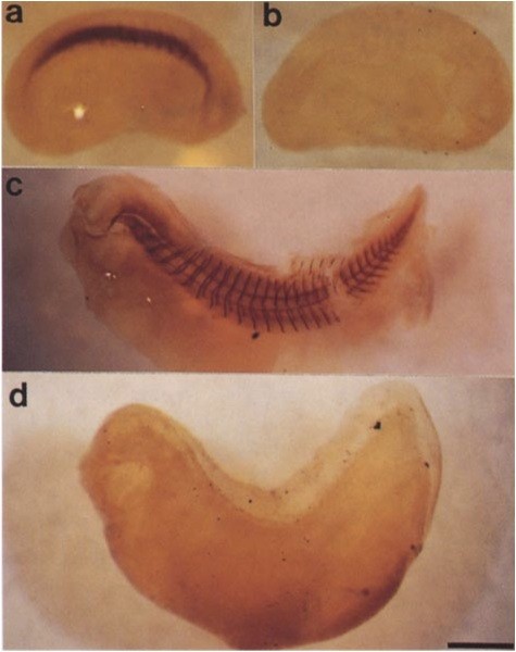 Figure 7. Immunohistochemical localization of type II collagen in stage 20 and 31 embryos. The embryos were processed by a whole mount procedure and bound antibody to type II collagen was localized with a peroxidase tag. At stage20 (a), antigen can be observed in the peri-notochordal region which already appears segmentally organized. The embryo in b was treated identically to that in (a) except it was incubated with culture supernatant from the nonimmuno-globulin secreting parental myeloma cell line to serve as a negative control. Immunolocalization of type II collagen at stage31(c);d shows a control embryo. Note the immunoreactivity localized to the vertebrae. Bar, 500um.