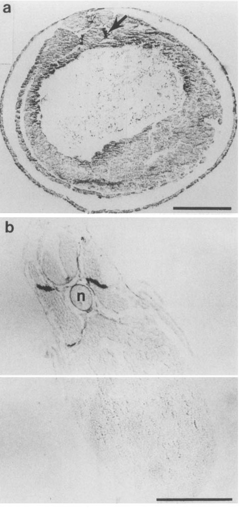 Figure 8 bright-field micrograph of a cross section through a stage 21 embryo that has been stained for type II collagen, demonstrating the localization of reaction product in the peri-notochordal region (arrow) . b is a bright-field micrograph of a section through the embryo shown in Fig. 7 c, without any additional staining in order to localize the immunoreactivity further. Note the presence of immunoreactivity in the basement membranes around the notochord (n) and on the ventral side of the neural tube, as well as in the floor plate, the sub-notochordal rod and in the developing vertebra. Bars, 250 um