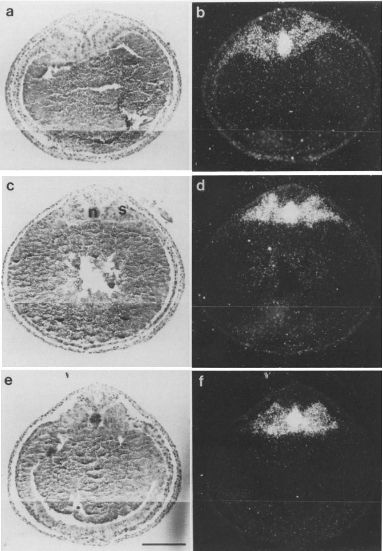 (a) and (b) are cut at a posterior level showing a high level of mRNA in the notochord. In addition, mRNA is detected throughout the somites and in the more dorsal half of the lateral plate mesoderm. c and d are cut at the level of the mid-gut showing that the signal is no longer detected in the lateral plate mesoderm but is restricted to the notochord and somites. e and f are cut at a more anterior level of the same embryo in which the intense signal in the notochord and sclerotome can be noted. The level of label in the remainder of the somite is relatively weaker than in the peri-notochordal region (n, notochord; s, somites). Bar, 250um.