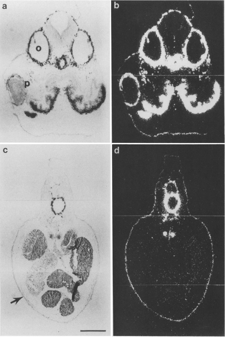 Figure 11. Bright-field (a and c) and dark-field (b and d) micrographs through the head (oblique cross section) and trunk (cross section) of a stage 46 embryo probed for type II procollagen mRNA with the general probe . In the head, mRNA is detected in the oto- cysts (o), chondrocranium, and periocular (p) tissue. In the section through the trunk, mRNA is detected in cells of the vertebra. In both the head and trunk regions, mRNA is detected in ectodermal cells (arrow). Bar, 250 um.