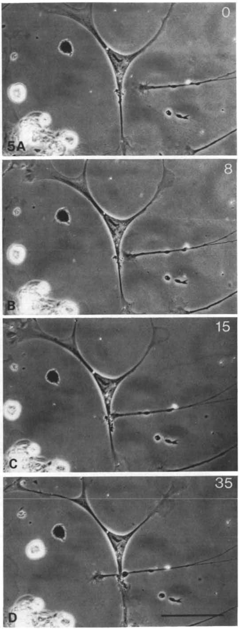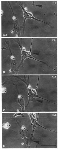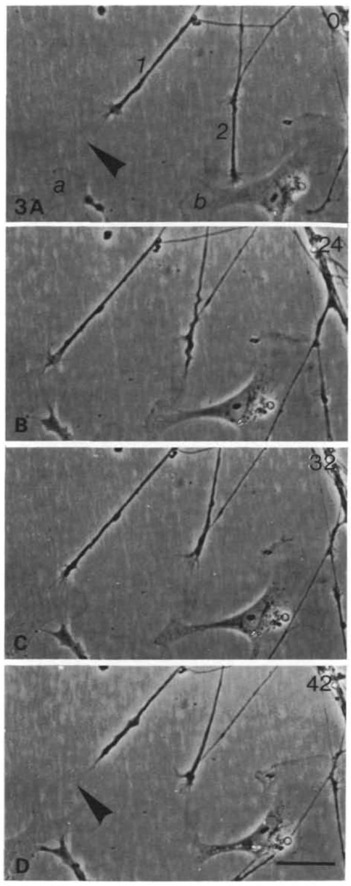 Figs 1 and 2. Sequences of photographs of temporal retinal growth cones contacting caudal tectal glial cells. The numbers at the top right of each photograph refer to the time in minutes since the sequence started. Fig. 1A-D. Temporal growth cone (A) advancing, (B) contacting, (C) collapsing and (D) retracting from an elongated caudal tectal glial cell. Scale bar represents 50/im. Fig. 2A-D. Temporal growth cone contacting and retracting from a highly flattened glial cell. Scale bar represents 50um.