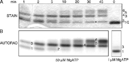 Figure 1. . Time course of in vitro phosphorylation of R-domain peptide by PKA revealed by SDS-PAGE. Incubations were with 50 μM γ32P-MgATP for various times as indicated (0–45 min), except for the sample shown in the lower right panel, which was incubated with 1 μM γ32P-MgATP for 2 min. Samples were separated by SDS-PAGE, gels stained with Coomassie blue (A, STAIN), dried, and exposed to X-ray film (B, AUTORAD). Numbers label bands of varying mobility (stain band labeled * is an impurity). The unphosphorylated R domain (sample at 0 min) migrates as a single species of ∼28 kD (band 0, upper panel, extreme right). |