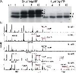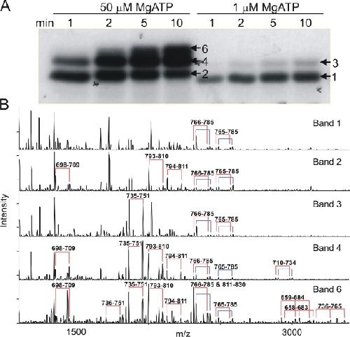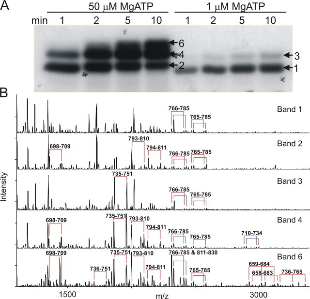 Figure 2. . Order of in vitro PKA phosphorylation of R-domain peptide determined by SDS-PAGE and mass spectrometry. (A) R-domain protein was incubated with 50 μM or 1 μM γ32P-MgATP. Samples were separated by SDS-PAGE and exposed to X-ray film. The gel bands indicated (numbered arrows) were excised (Band 6 was excised from the upper part of the top-most band in the 10-min lane at 50 μM MgATP, as indicated by the arrow), digested by trypsin, and the resulting proteolytic products subjected to mass spectrometric analysis. (B) MALDI-ion trap mass spectrometric analysis of the five bands indicated in A showing that serine 768 is the most readily phosphorylated residue. Pairs of peaks separated by 98 D (joined by the red and blue connecting lines) provide signatures for phosphorylated peptides (see text). The blue lines designate peptide that is singly oxidized at methionine 773 (or 721, Band 4); the red lines indicate the corresponding unoxidized peptides. The amino acid residues of these phosphopeptides are indicated above each pair of peaks. For example, 766–785 and 765–785 correspond to two alternative cleavage products of the trypsin digestion. Because the masses of phosphorylated peptides 811–830 and 766–785 are respectively 2411.110 and 2411.164 (Table I), these two species were not resolved in this experiment, but the presence of 811–830 was inferred from the change in ratio of the pair of peaks associated with this mass in Band 6 (bottom panel) compared with other bands, which contain only 766–785. The peptide 766–785 contains a single methionine, which was partially oxidized to give the two pairs of peaks seen in all five panels. As peptide 811–830 contains no methionine residue, the presence of peptide 811–830 together with peptide 766–785 is signaled by a change in the ratio of the pairs of peaks 16 D apart. |