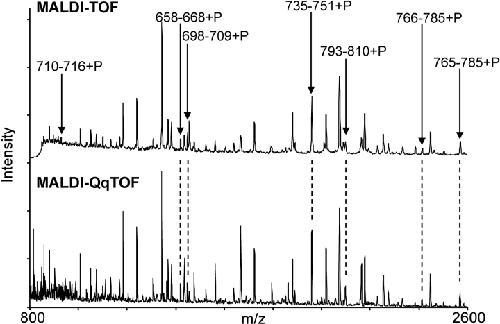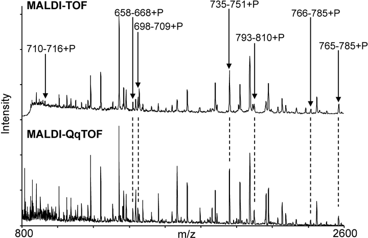 Figure 4. . Serine 768 of WT CFTR is significantly phosphorylated in vivo in resting oocytes. MALDI-TOF (top) and MALDI-QqTOF (bottom) mass spectra of peptides obtained by trypsin digestion of WT CFTR immunoprecipitated from the membranes of resting oocytes that were lysed in the presence of phosphatase inhibitors to preserve phosphoserines present at that instant. Arrows identify phosphorylated (+P) peptides (molecular masses are listed in Table I). |