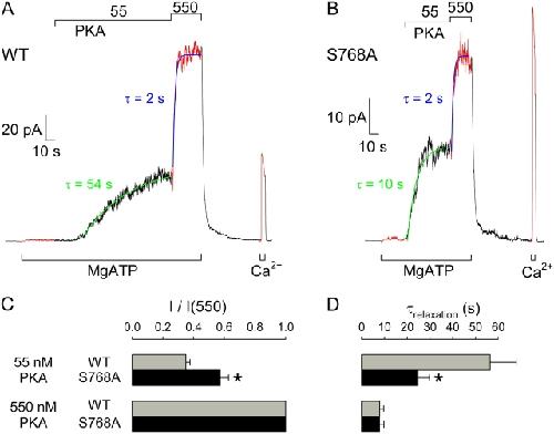 Figure 5. . Activation in excised patches of macroscopic WT and S768A CFTR currents by low and high concentrations of PKA catalytic subunit. (A and B) Currents recorded in patches containing hundreds of WT (A) or S768A (B) CFTR channels. No substantial current is activated in either case by 2 mM MgATP applied ∼2 min after patch excision, but 55 nM, and 550 nM, PKA catalytic subunit activate increasing amounts of current in both cases. Solid green and blue lines show single-exponential fits to the current time courses, with indicated time constants; activation/inactivation time course of endogenous Ca2+-activated Cl− channel current elicited by a brief pulse of 2 mM Ca2+ was used to estimate the speed of solution exchange. (C) Fractional current activated by 55 nM PKA was significantly smaller for WT (gray bar) than S768A (black bar; *, P = 0.0024) CFTR channels; mean steady current in 55 nM PKA was divided by mean steady current in the same patch at 550 nM PKA. (D) Time constants of macroscopic current relaxations upon addition of 55 nM (top) or 550 nM (bottom) PKA, for WT (gray bars) and S768A (black bars) CFTR; activation was faster for S768A at low (*, P = 0.036), but not at high [PKA]. |