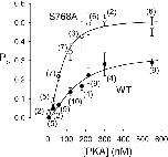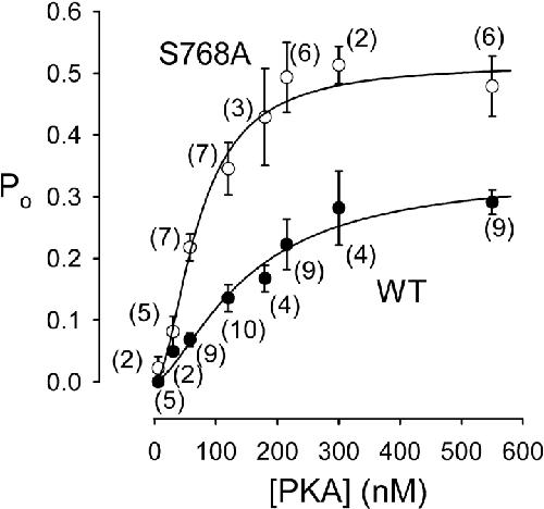 Figure 7. . Dependence on [PKA] of open probability, Po, of WT (•) and S768A (○) CFTR channels. Steady-state mean Po measured in (n) excised patches, containing few channels, during exposure to 6–550 nM PKA plus near-saturating [MgATP] (1–2 mM), is plotted against [PKA]. Lines show nonlinear least-squares fits to the Hill equation, yielding Po,max = 0.34 ± 0.06, K0.5 = 149 ± 46 nM, nH = 1.5 ± 0.5 for WT, and Po,max = 0.51 ± 0.05, K0.5 = 71 ± 12 nM, nH = 1.8 ± 0.5 for S768A. |